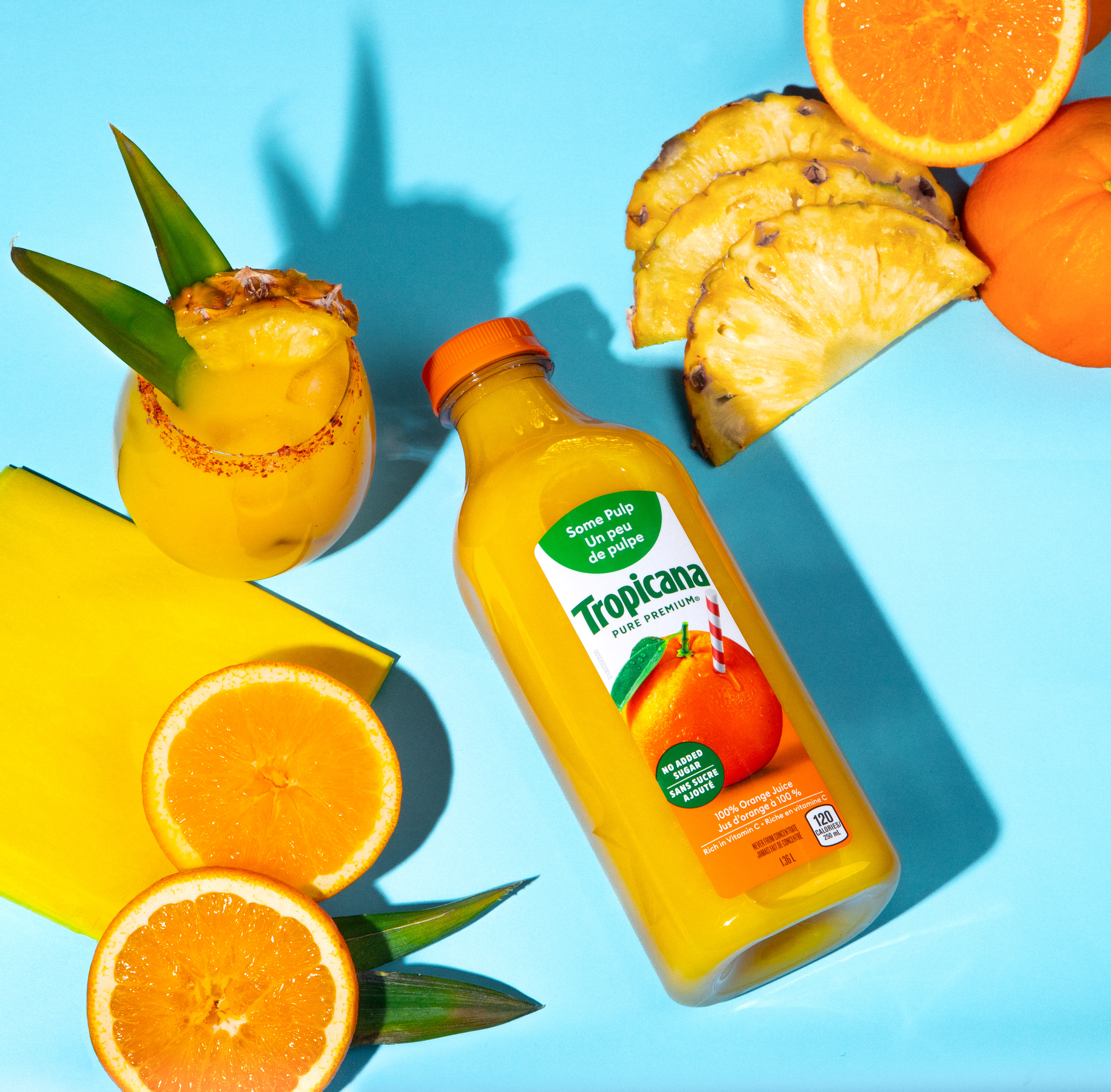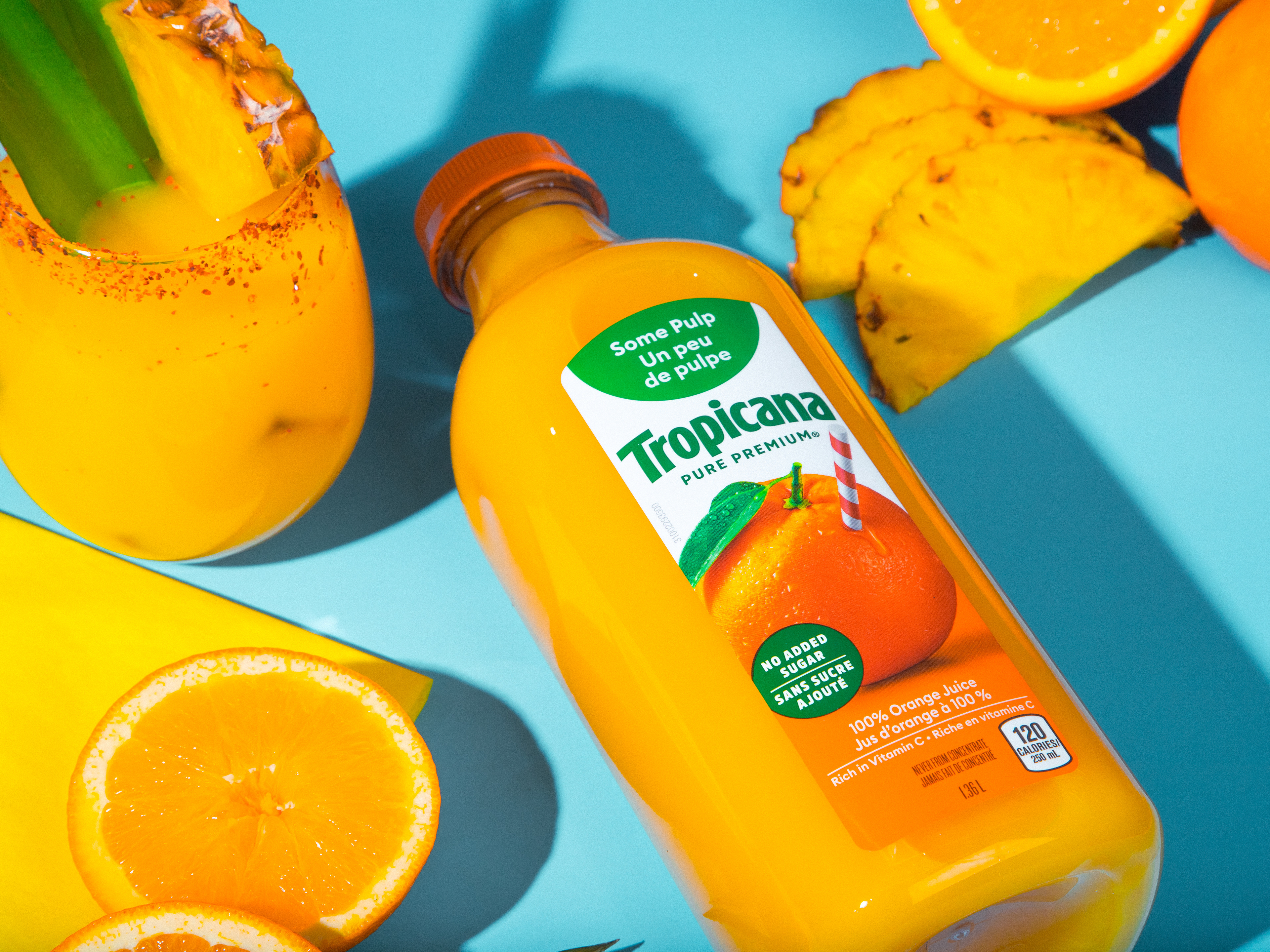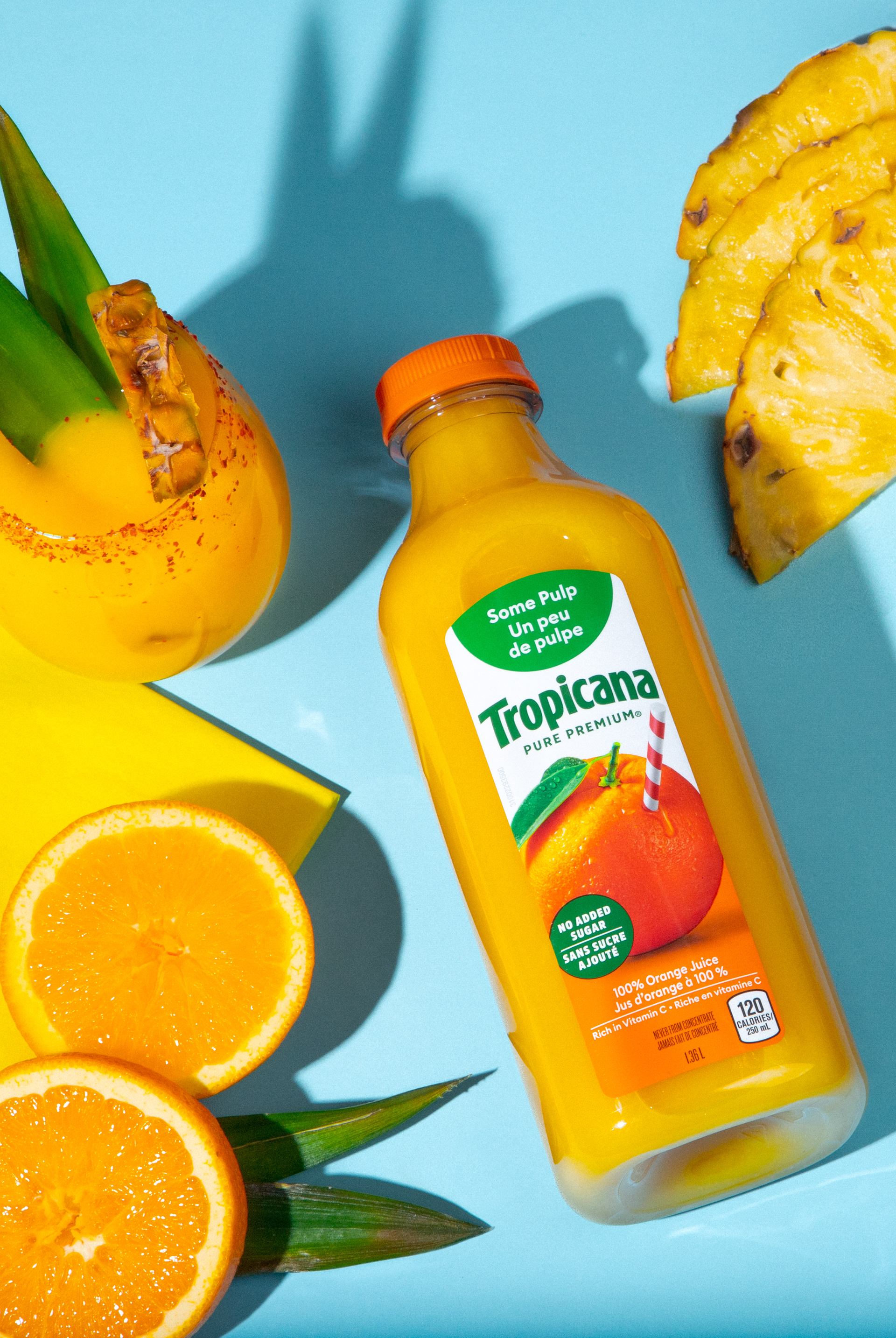 This product photography project features a vibrant scene built around Tropicana orange juice, created as part of a studio assignment during school. The shoot focused on bright colors, fresh ingredients, and dynamic lighting to emphasize the refreshing and energetic qualities of the product while exploring composition and commercial-style beverage photography.